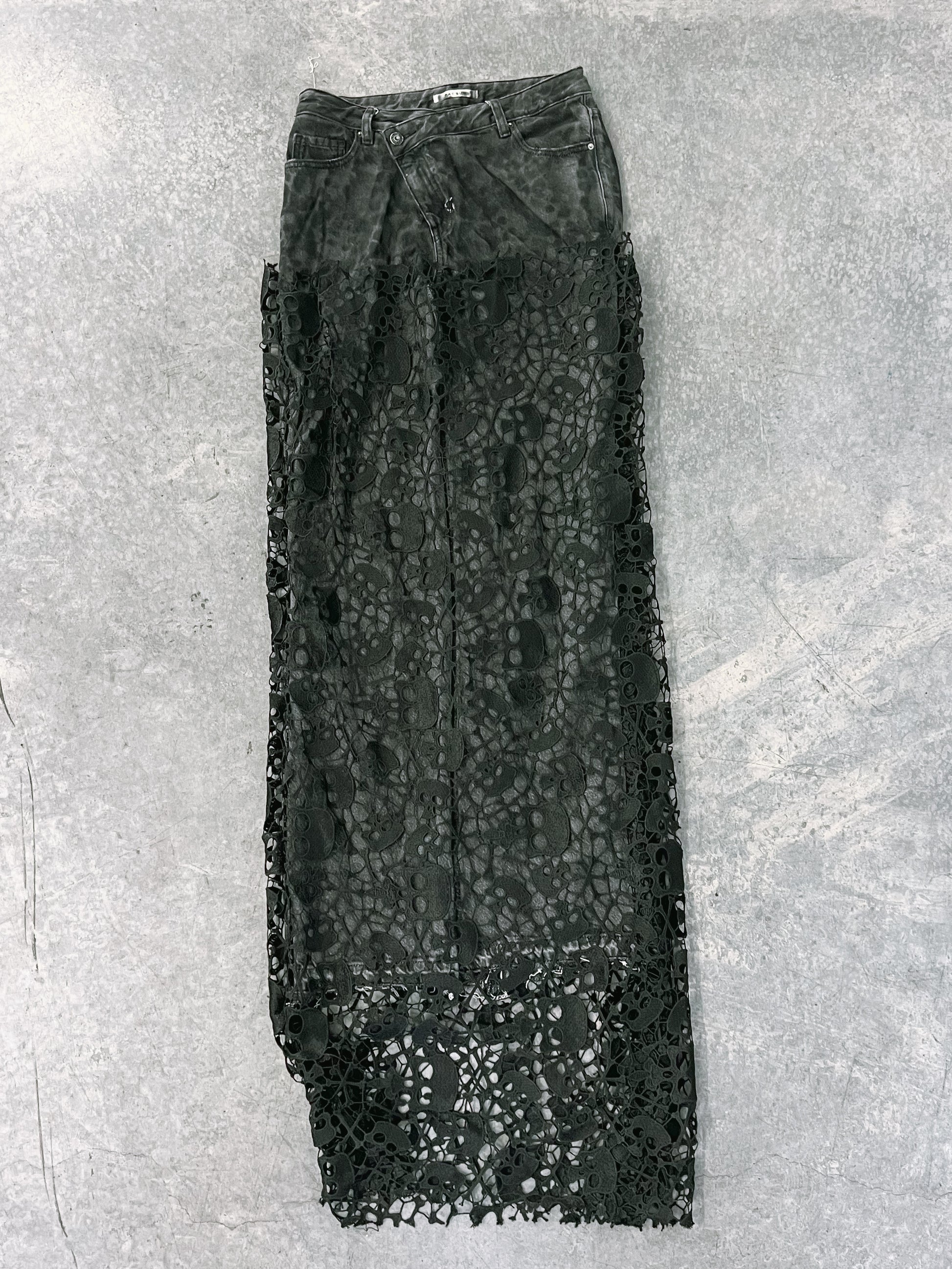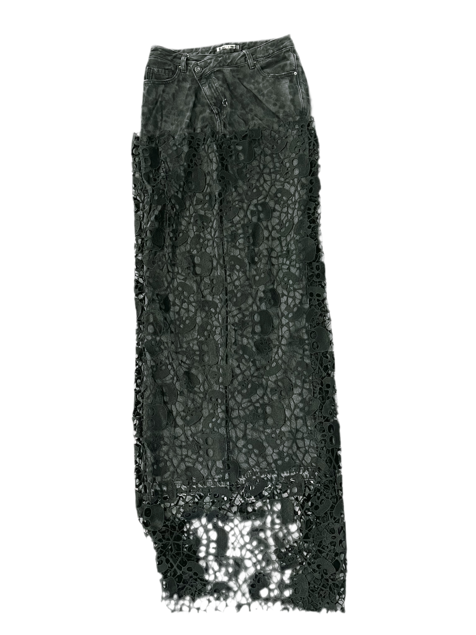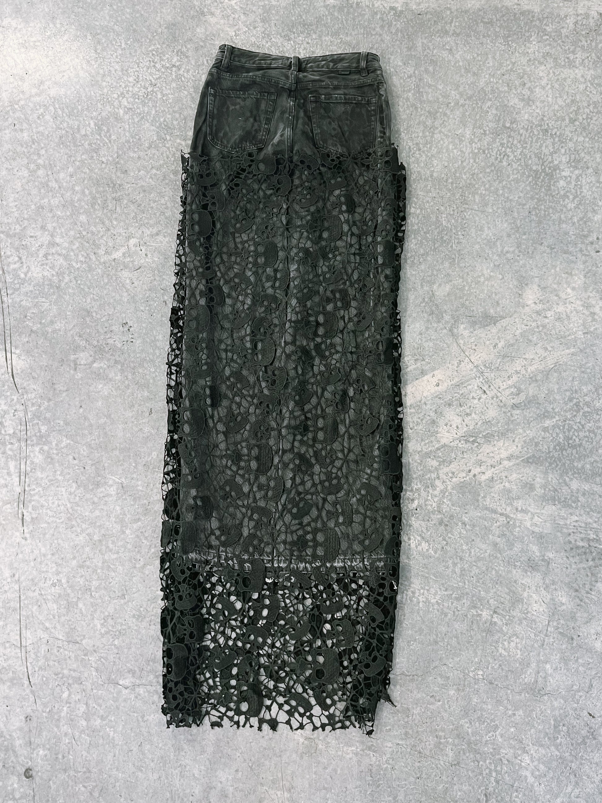 Oversized denim skirt with skull lace overlay. Skull pattern print. Can be styled as a dress.