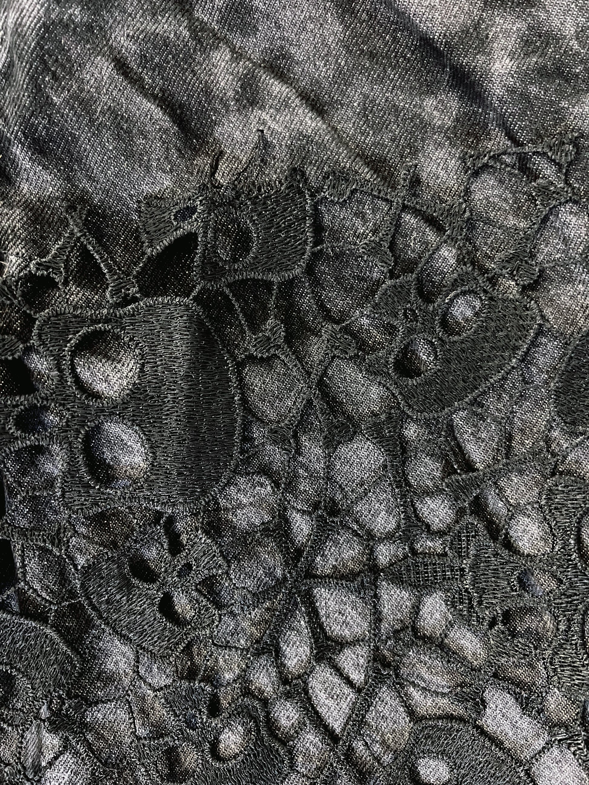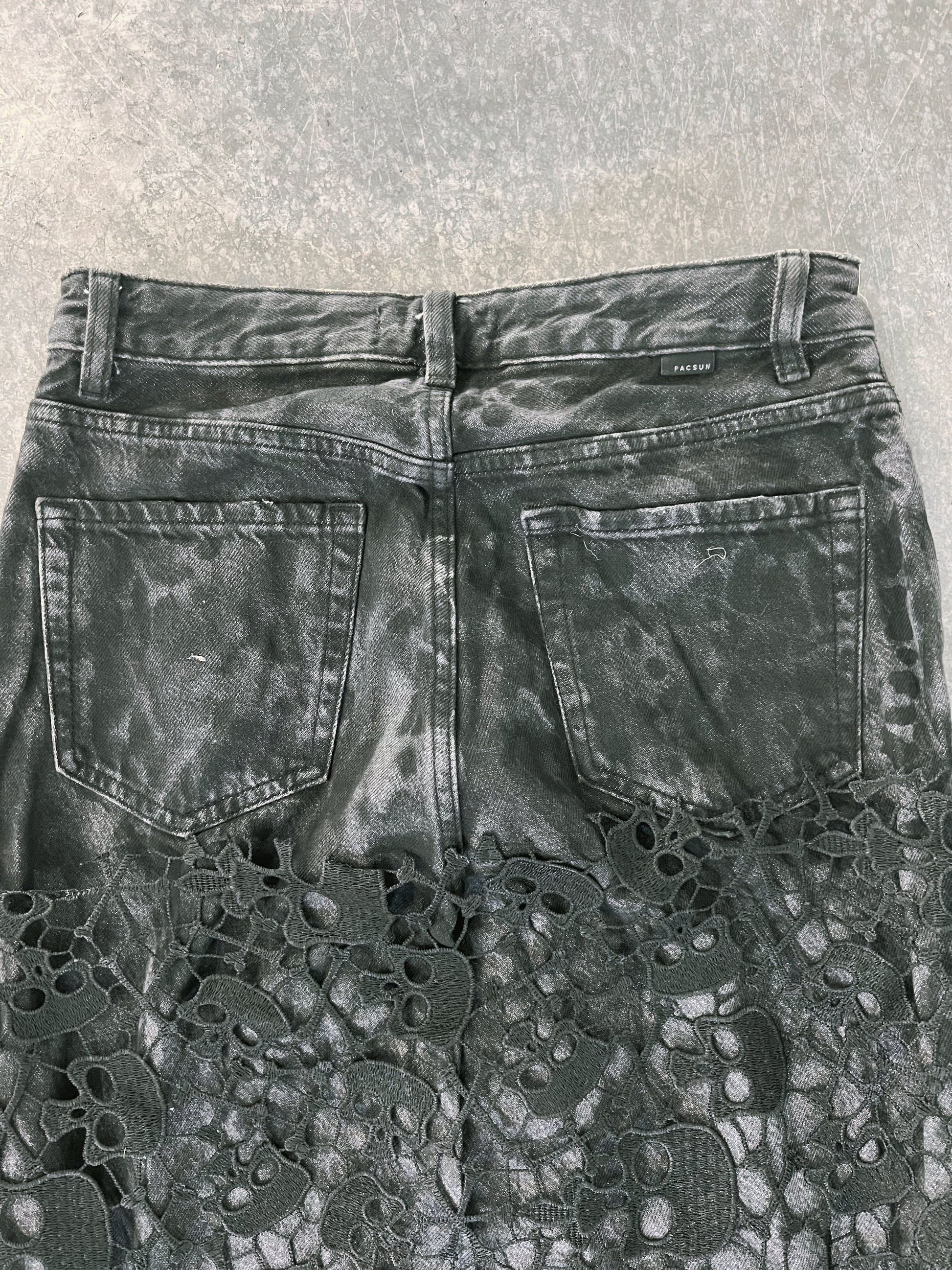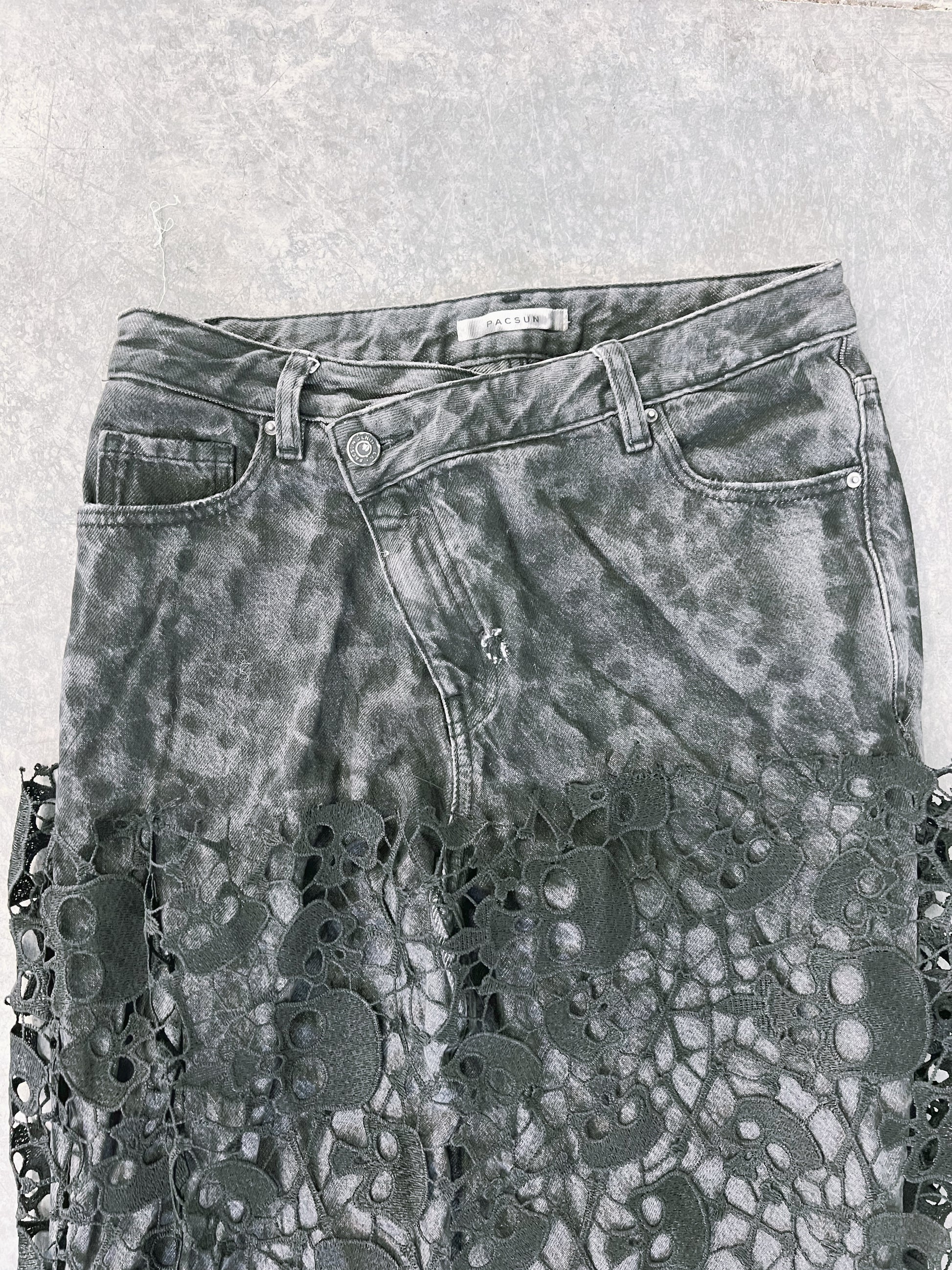 Oversized denim skirt with skull lace overlay. Skull pattern print. Can be styled as a dress.