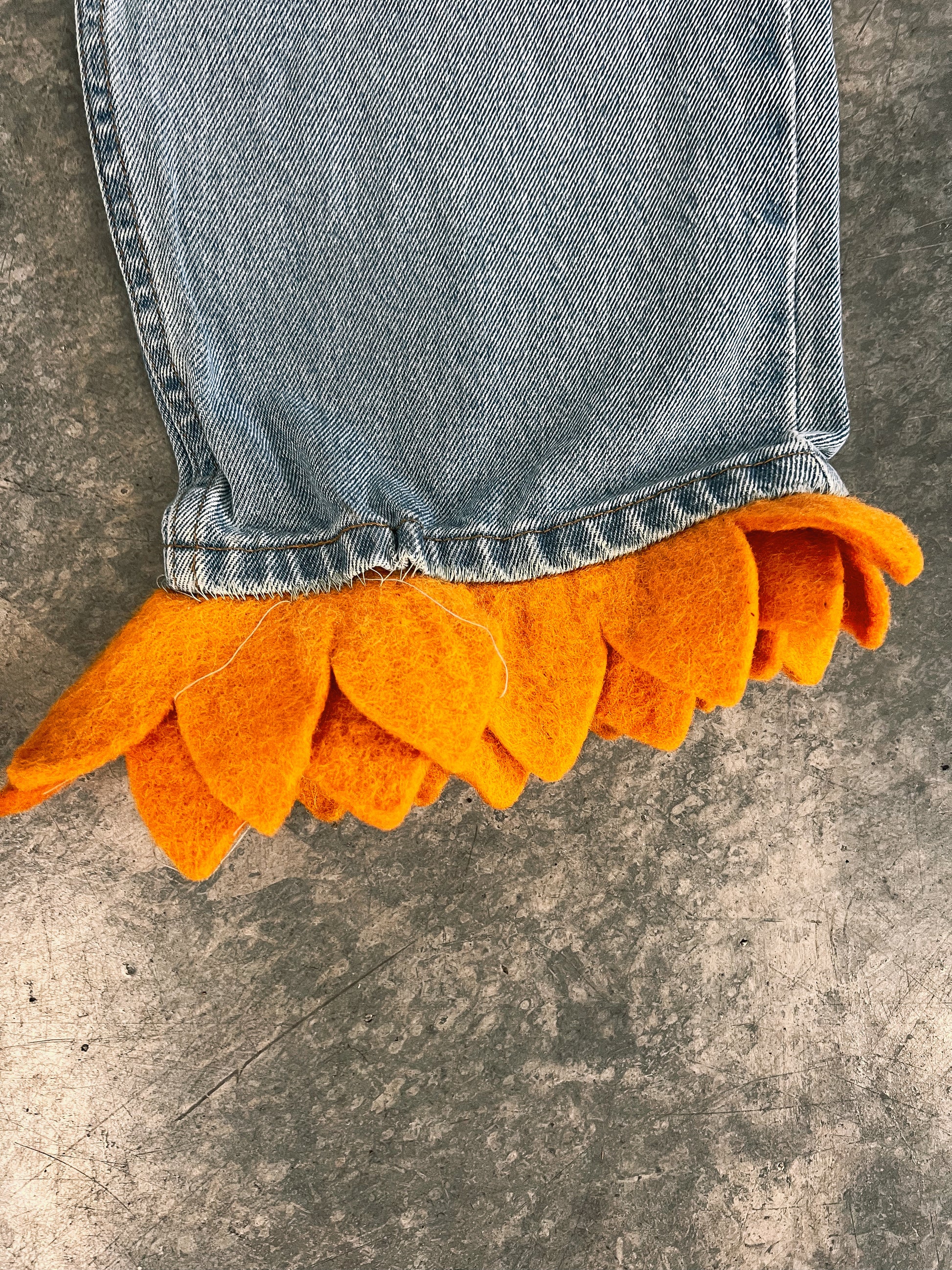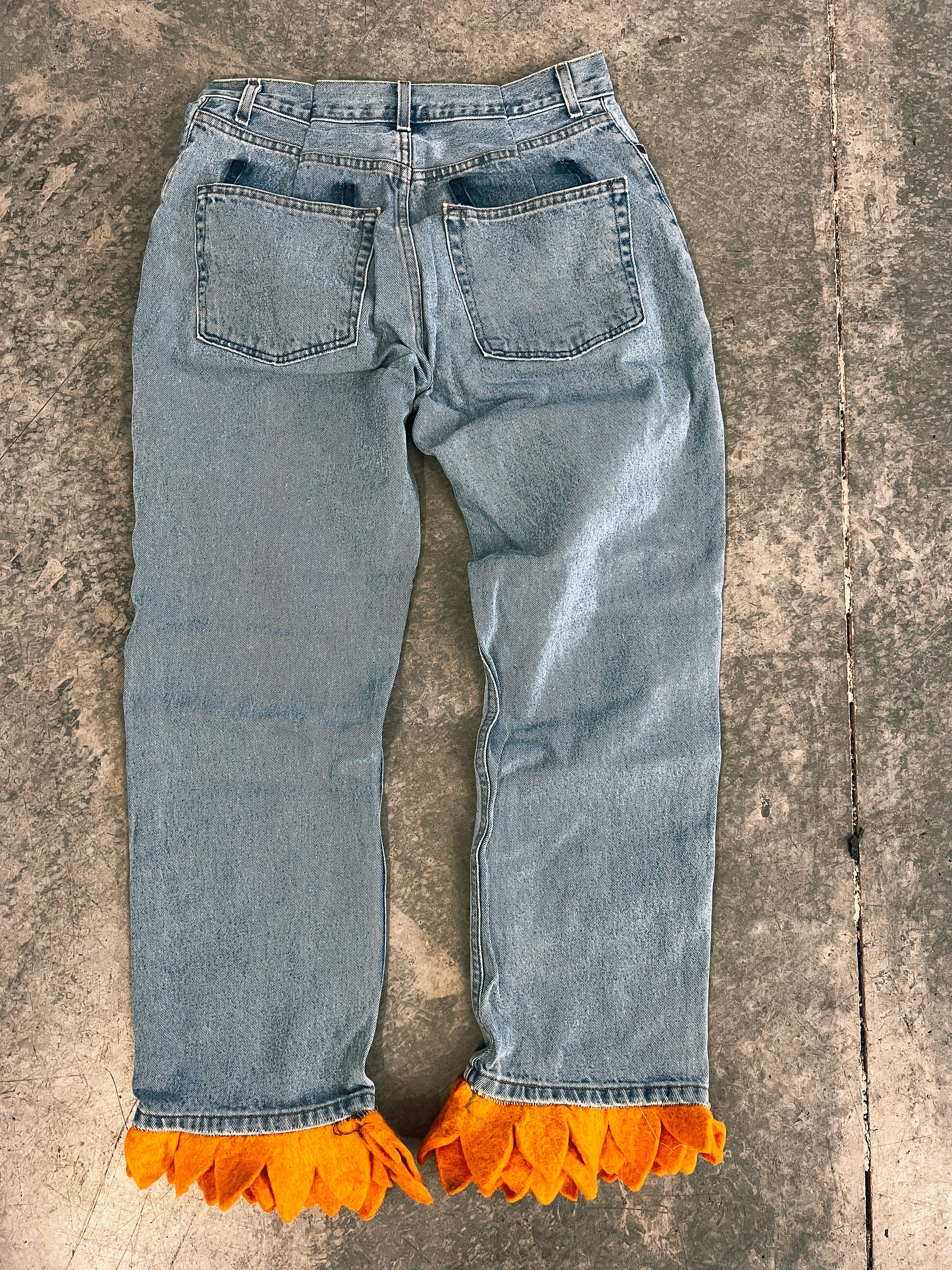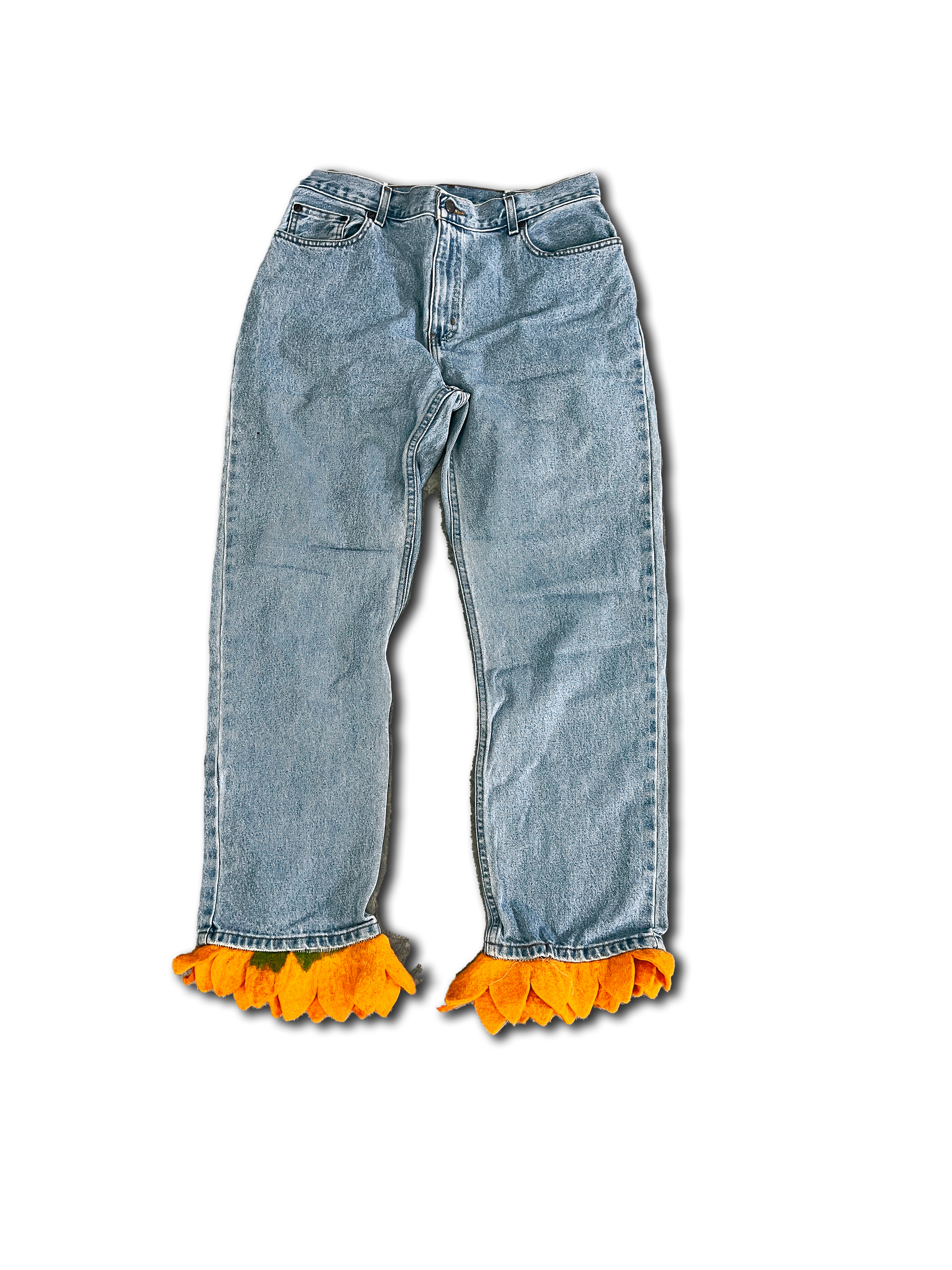 Elevate your style with our FLOWER BOY pants. Crafted from upcycled jeans, these pants feature exquisite sunflower accents, adding a touch of sophistication to your wardrobe. Embrace sustainability while making a fashion statement. Size 32"